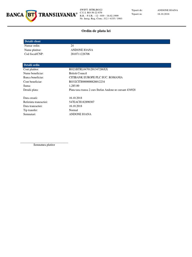 Ordin de plata bt24. Welcome to bt24 internet banking. Un ordin de plata se regaseste in starea tranzactie in asteptare fonduri insuficiente te rugam sa alimentezi contul atunci cand acesta nu poate fi procesat temporar datorita lipsei de fonduri. In continuare se acceseaza butonul vizualizare detalii din partea dreapta a ordinului de plata si apoi se selecteaza butonul tiparire. Daca in ziua selectata pentru procesare contul este alimentat cu suma necesara transferului pana la ora limita 17 30 plata va fi procesata.